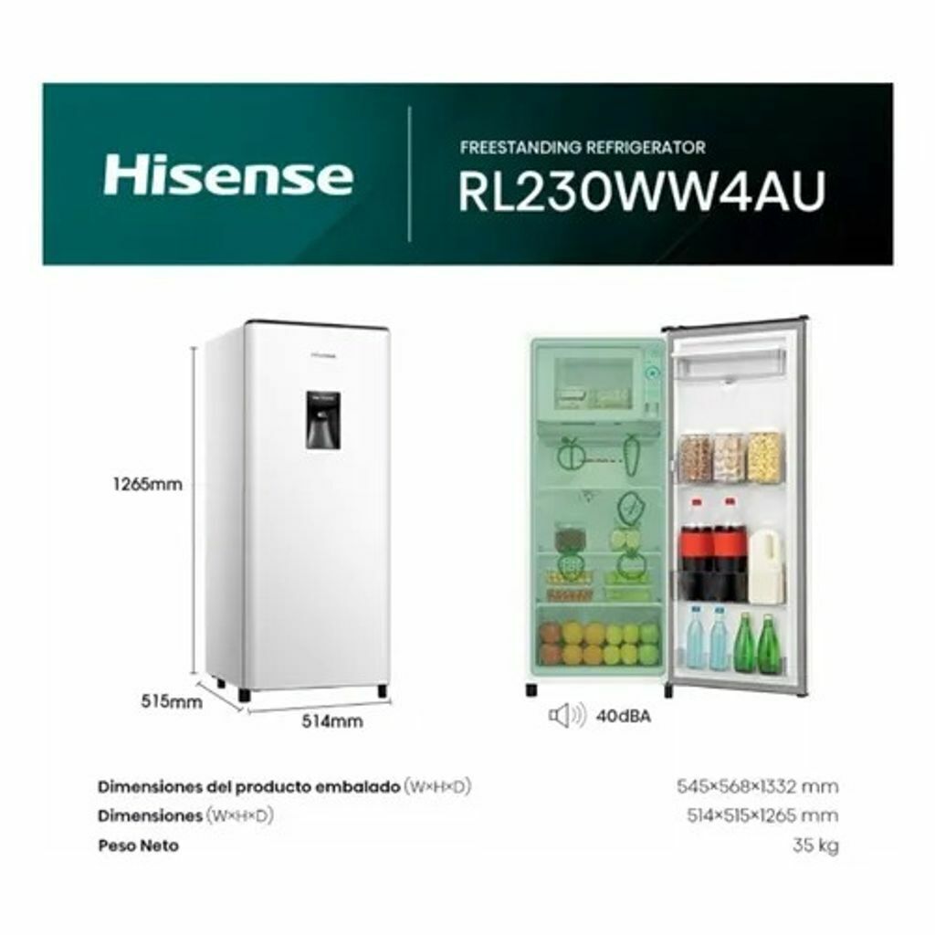 Heladera sin Freezer Hisense RL230WB4AU con dispenser de agua, ofrece una capacidad bruta de 177 litros y neta de 161 litros, perfecta para espacios compactos o como complemento, con eficiencia energética A, utiliza el refrigerante ecológico R600a, brindando un consumo reducido y amigable con el medio ambiente, equipado con luz LED para una mejor visibilidad interior, cuenta con estantes de vidrio que añaden elegancia y resistencia, su sistema de defrost semiautomático permite descongelar fácilmente con solo presionar un botón, además, incluye un pequeño congelador integrado, ideal para mantener alimentos frescos en el día a día.