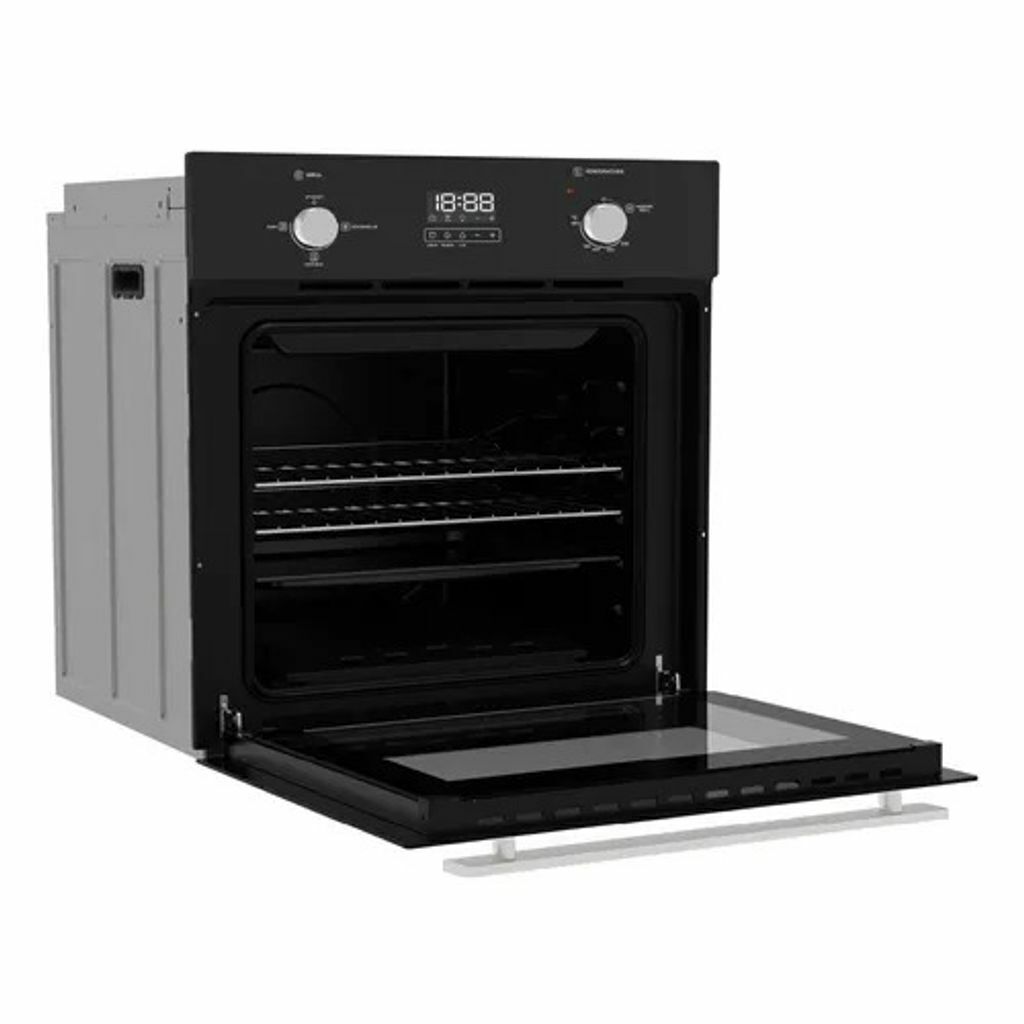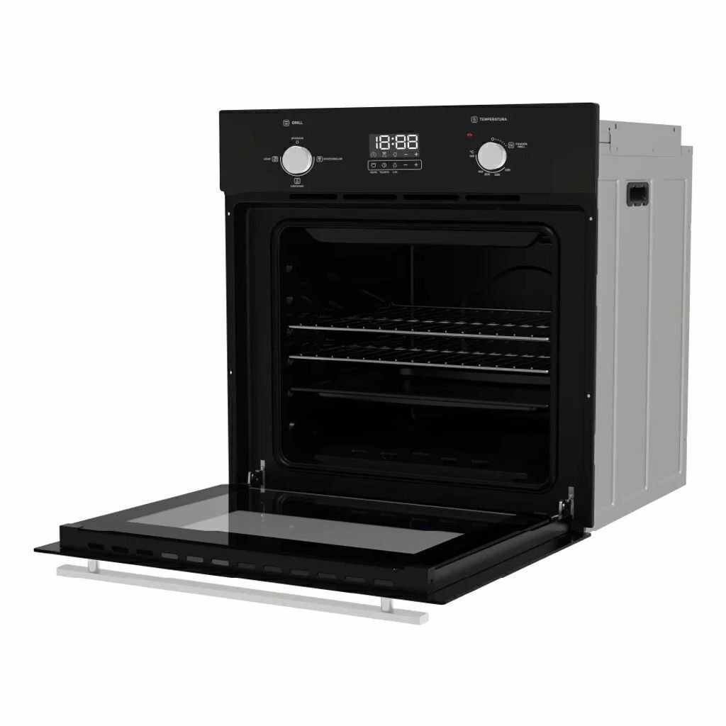 Horno a gas empotrable de 60 litros de capacidad. Color negro. Encendido eléctrico integrado a la perilla. Puerta de vidrio panorámica. 2 parrillas interiores cromadas. Display digital con hora, timer digital y luz interior. Control de temperatura manual por perillas con 5 posiciones. Sus funciones son: Asar, Gratinar y Descongelar. Grill eléctrico para tostar, dorar y gratinar. Cocción hasta 250 grados. Potencia de horneado de 1780 W. Válvula corta gas. Sistema de limpieza Easy Clean Pro. Incluye bandeja. Origen China.