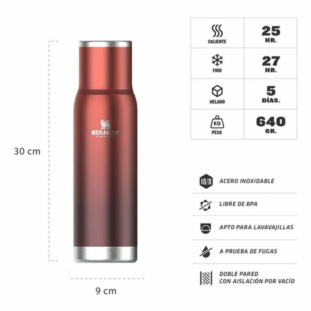Porque algunas cosas son para toda la vida, este termo Stanley fue pensado para acompañarte a través de los años, ya que durabilidad y estilo son las palabras que definen a la marca. Gracias a su resistencia, obtendrás un gran rendimiento térmico y garantizarás que el líquido permanezca con la temperatura ideal por más tiempo. Además, al ser a prueba de fugas, dejarás de preocuparte por posibles derrames mientras realizás largos viajes o de camino al trabajo.